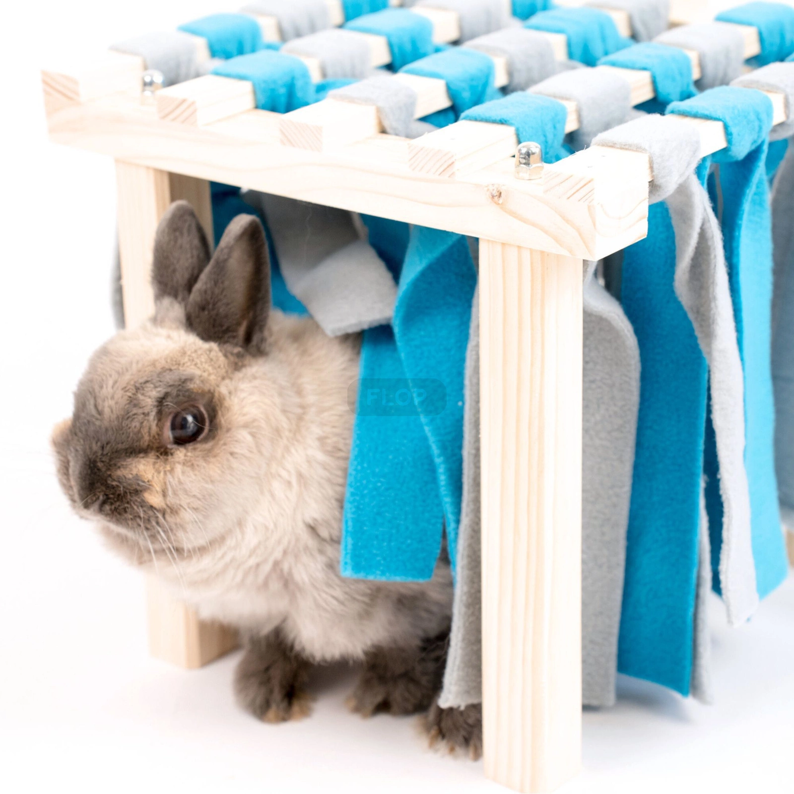 Zabawka Fleece Forest FLOP 25×25×(h)26 cm w eleganckim zestawieniu kolorów **szary-turkus** to aktywna, bezpieczna i wyjątkowo atrakcyjna propozycja dla królików (oraz innych podobnych małych ssaków). Solidna, drewniana konstrukcja o nowoczesnym designie, wyposażona w miękki, wymienny barwny parawan z polaru — wszystko to łączy się, by zapewnić Twojemu przyjacielowi godziny zabawy, kryjówki i relaksu.