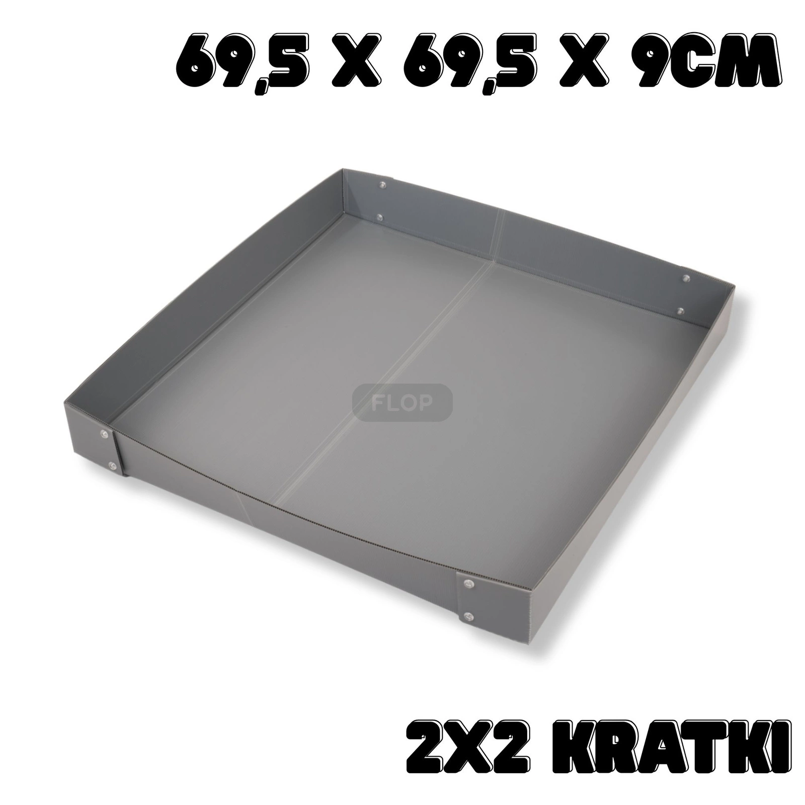 Przedmiotem oferty jest kuweta do klatki/kojca 2x2 kratki w standardowym systemie chińskich kratek o wymiarach 35x35 cm. Po złożeniu tworzy dno o wymiarach ok. 69,5x69,5x(h)9 cm, pasujące do typowych systemów produkowanych w chinach.