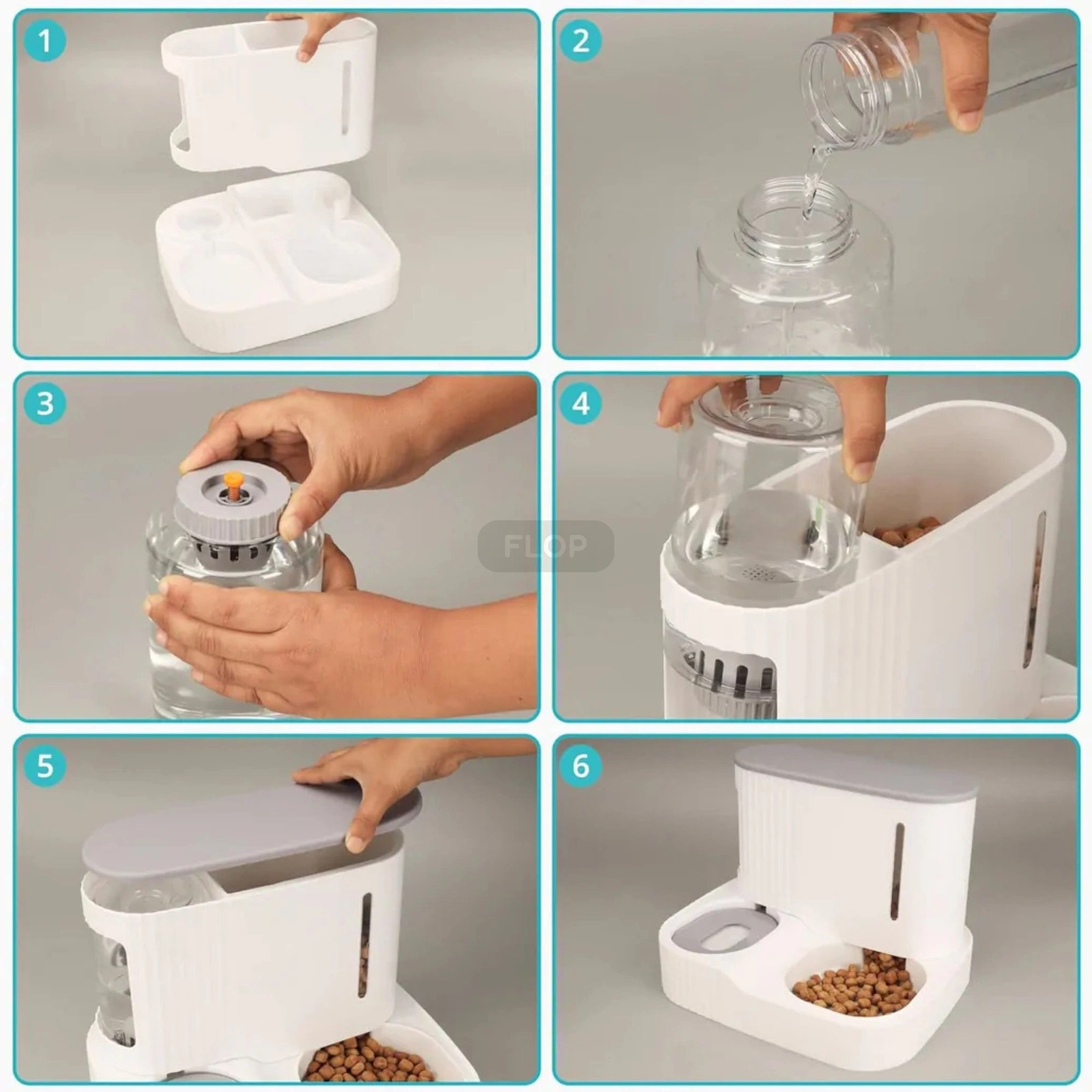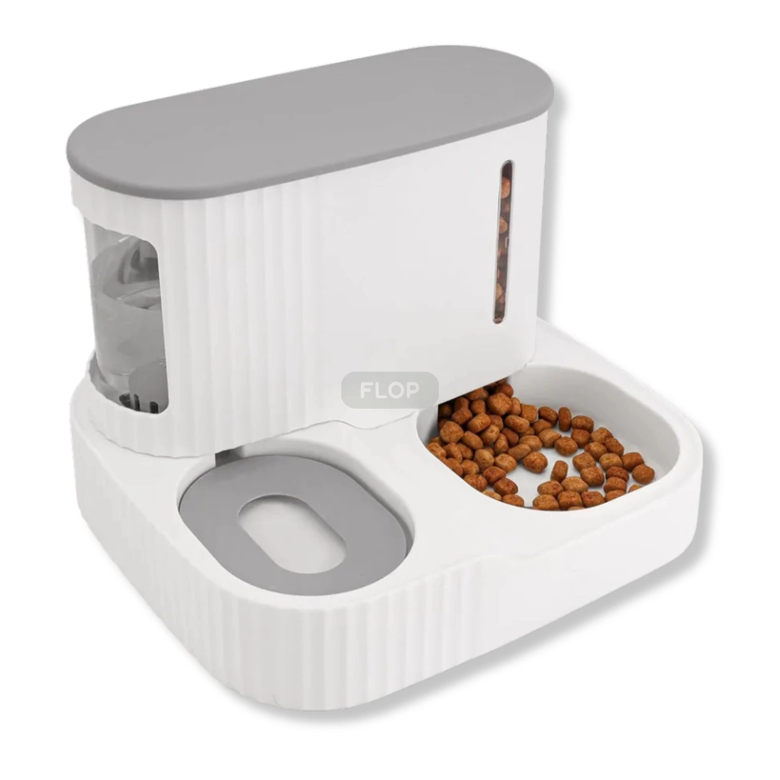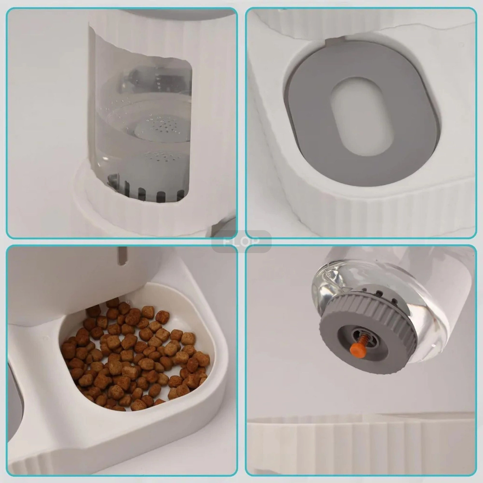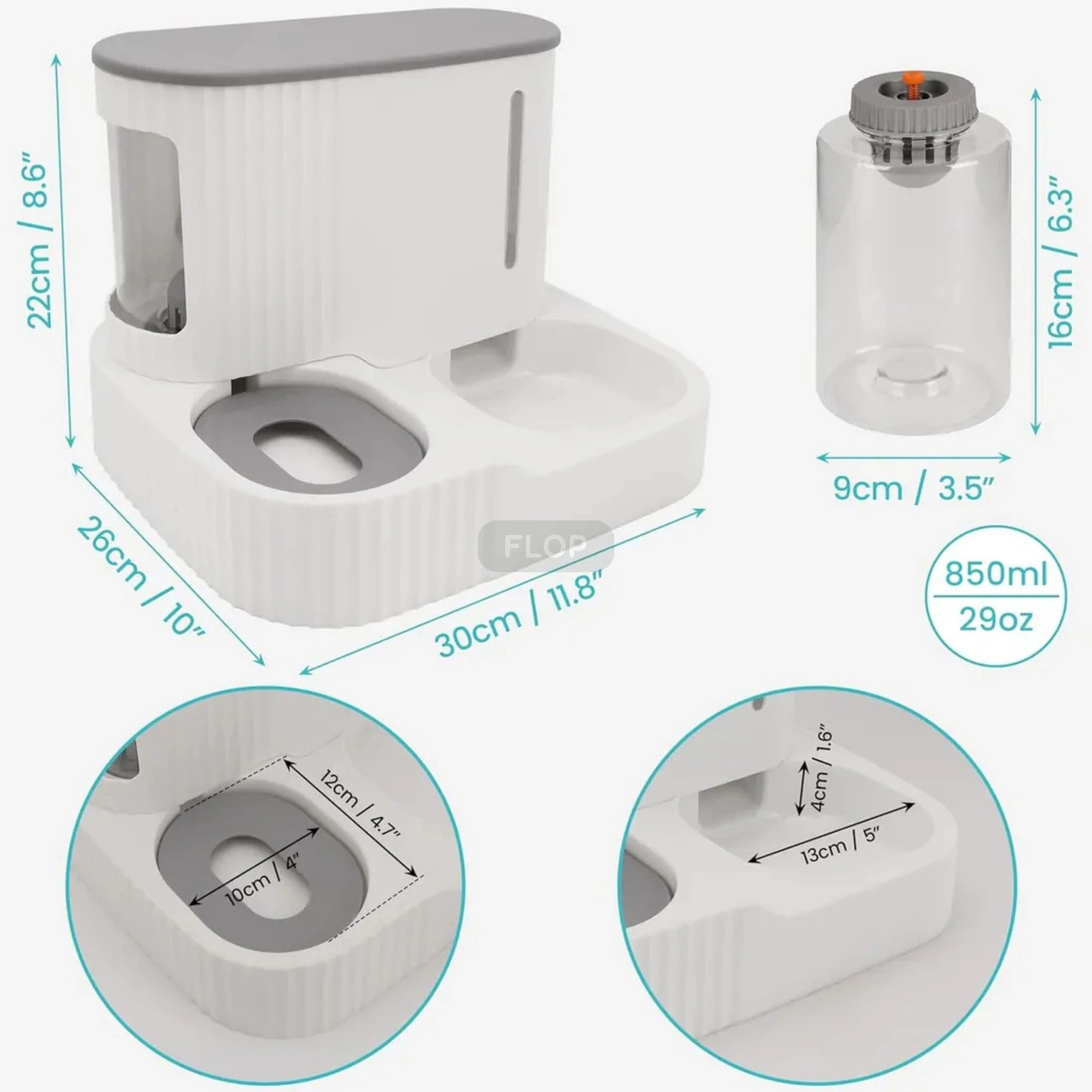 Pojemnik na karmę o pojemności 3 l automatycznie uzupełnia miskę w miarę ubywania granulatu, a zbiornik na wodę (do 850 ml) zapewnia stały, kontrolowany wypływ świeżej wody. Boczne okienka pozwalają łatwo kontrolować poziom napełnienia, a konstrukcja zapobiega rozsypywaniu pokarmu. Całość wykonano z bezpiecznych, nietoksycznych materiałów ABS i stali nierdzewnej – wolnych od BPA i przyjaznych dla zwierząt.